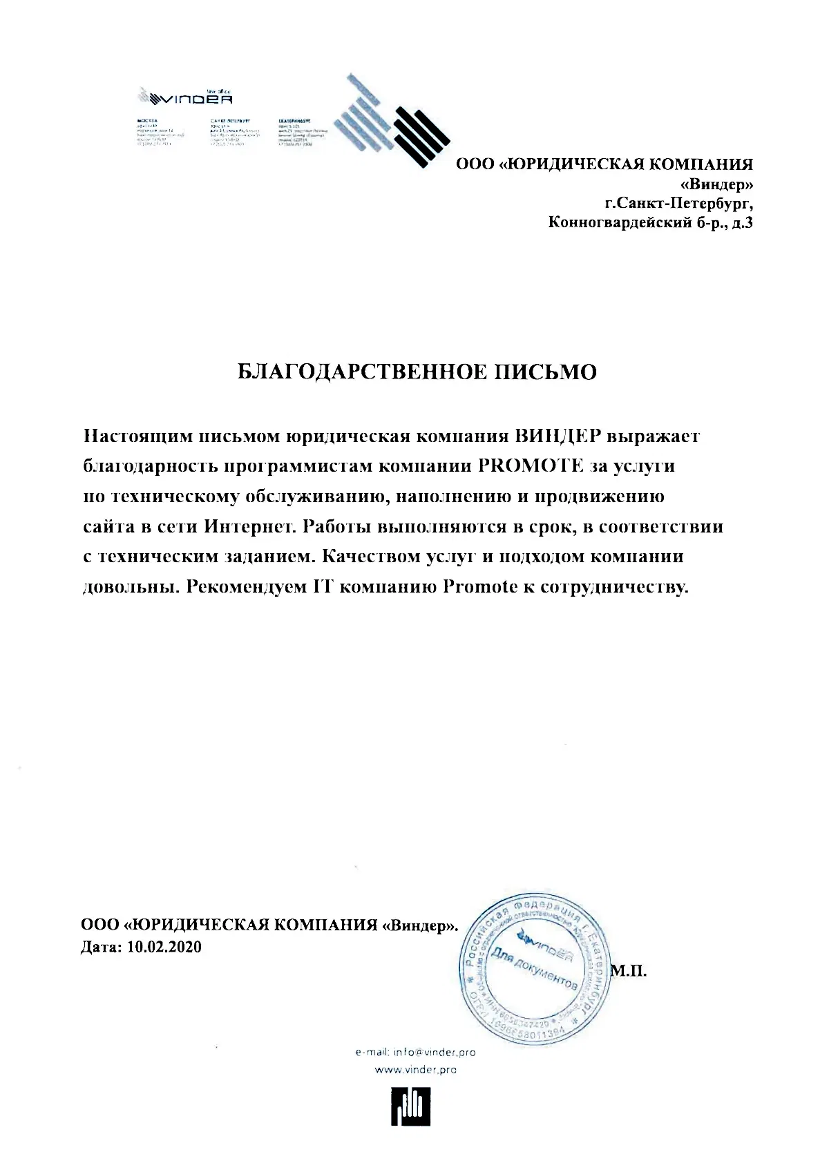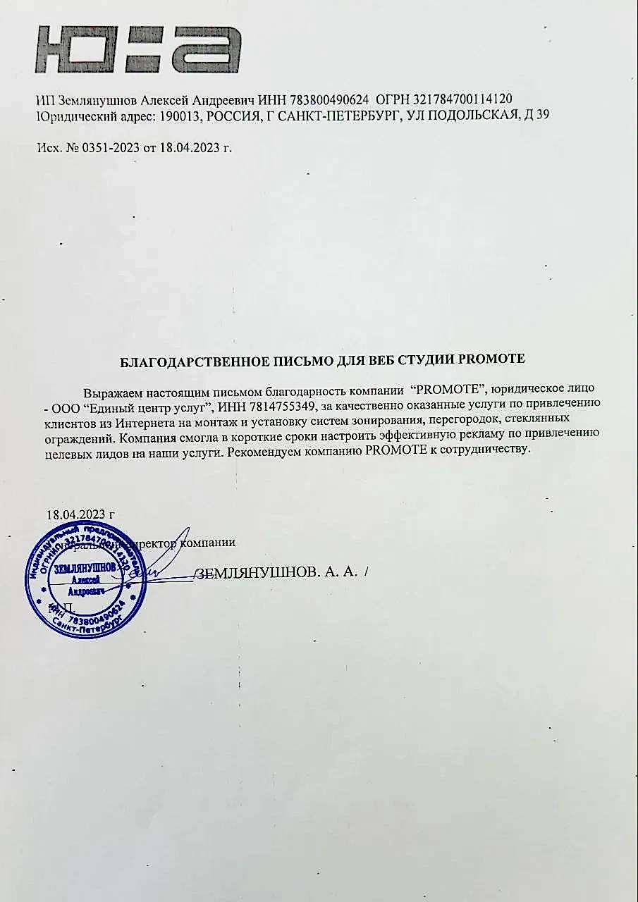 За годы работы компания Promote приобрела опыт в разработке, верстке, продвижении более 40 онлайн проектов. Это сайты услуг, лендинги, интернет-магазины. Качество наших работ, стабильный поток лидогенерации и клиентов, проверенные решения в сфере IT разработок и маркетинга в Интернете, подтверждаются отзывами и письмами благодарности от наших клиентов. Посмотрите наши корпоративные отзывы на данной странице ниже. Доверьте разработку Вашей онлайн платформы, ее последующее обслуживание и комплексное продвижение Вашего бренда и Вашей компании профессионалам. Опыт 5 лет, реализовано более 40 проектов. Штат из 7 специалистов различного профиля.